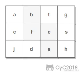 使用回溯法(backtracking)进行求解,它是一种暴力搜索方法,通过搜索所有可能的结果来求解问题。回溯法在一次搜索结束时需要进行回溯(回退),将这一次搜索过程中设置的状态进行清除,从而开始一次新的搜索过程。例如下图示例中,从 f 开始,下一步有 4 种搜索可能,如果先搜索 b,需要将 b 标记为已经使用,防止重复使用。在这一次搜索结束之后,需要将 b 的已经使用状态清除,并搜索 c。