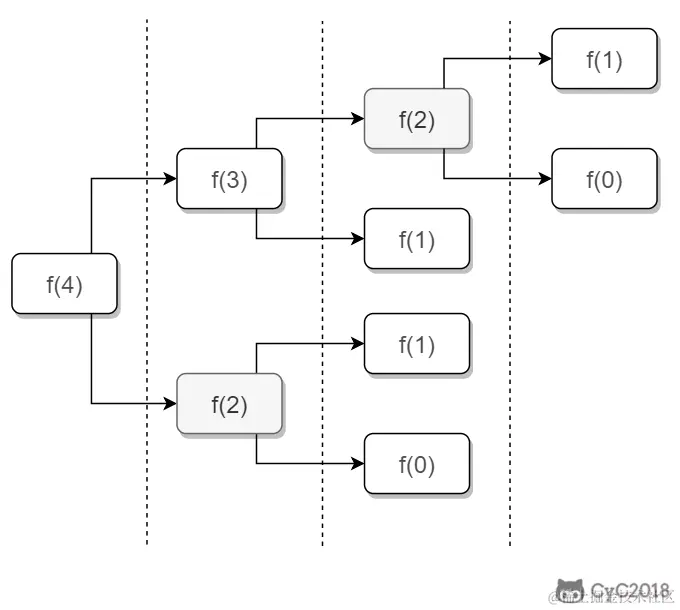 如果使用递归求解,会重复计算一些子问题。例如,计算 f(4) 需要计算 f(3) 和 f(2),计算 f(3) 需要计算 f(2) 和 f(1),可以看到 f(2) 被重复计算了。