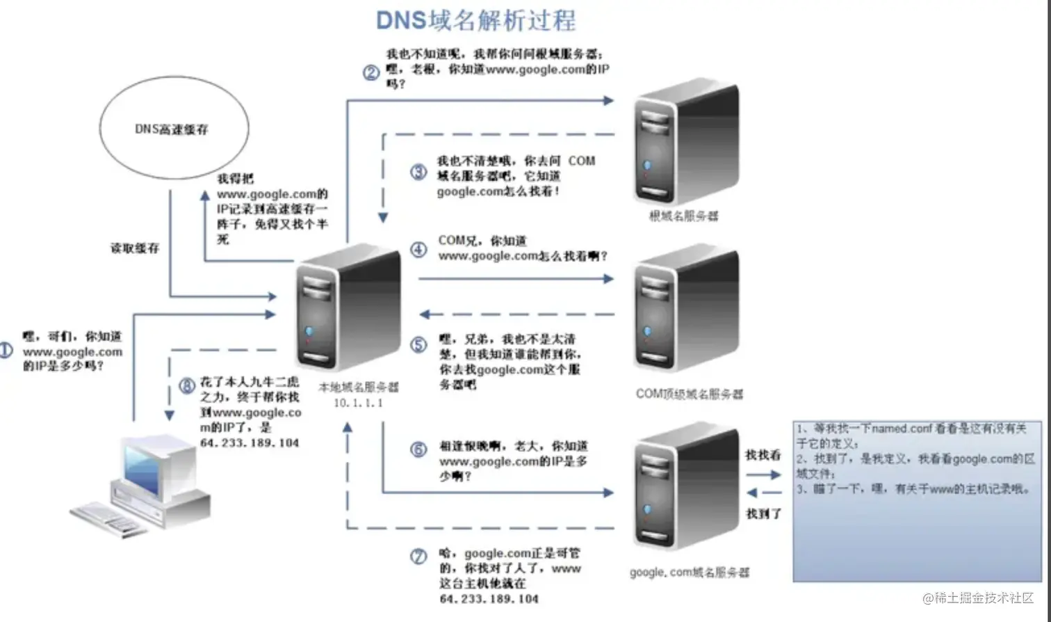 - 接着本地域名服务器到顶级域名服务器去查询,顶级域名服务器返回二级服务器(.google.com)的地址;