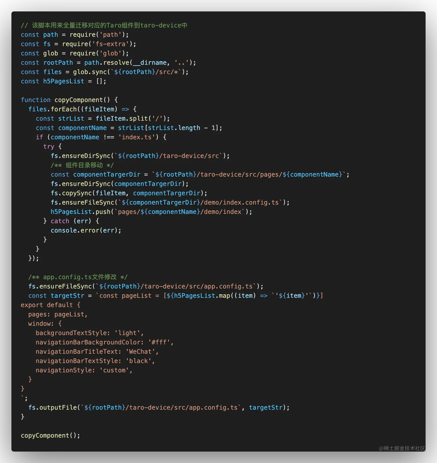 当然了,在进行项目部署或者开发者第一次运行项目的时候,我们需要一个能够全量迁移组件的脚本,因为我把taro的pages和app.config.ts文件都加到了gitignore文件中。脚本也比较简单,代码一看就会。