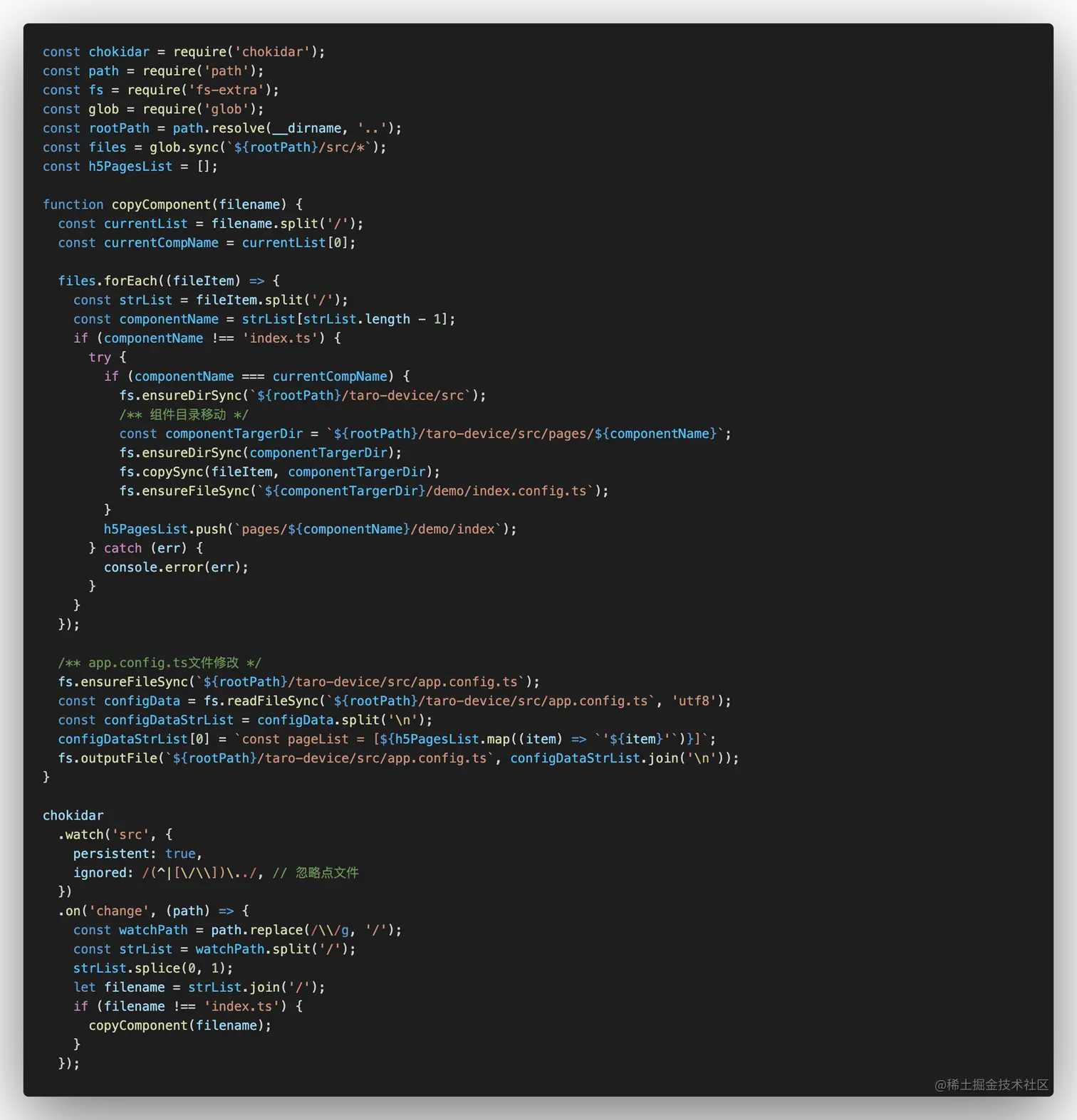 在dumi的src文件夹发生修改的时候,我们需要将更改的组件同步迁移到taro项目中,于是,我们可以比较轻松的写下以下的脚本,这里运用到了多个js库,感兴趣的可以去研究一下。但不建议使用原生node做文件的改动监听,因为在windows上会莫名触发多次change改动。