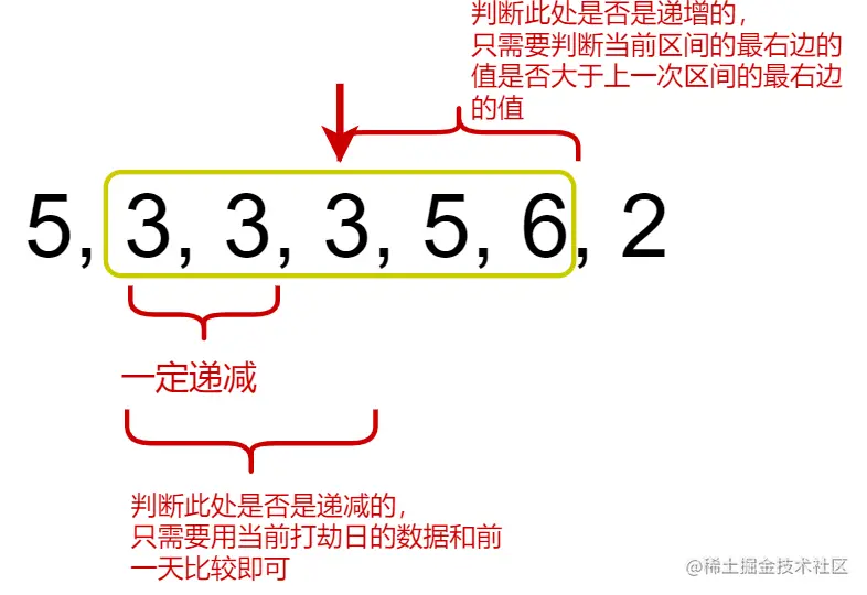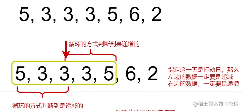 选择第一个区间的时候,打劫日是在下标为 2 的位置上,数字是 3, 那么需要循环的的去判断 打劫日 和 前 2 个数字,是否递减,同理,循环判断打劫日和后 2 个数字是否是递增,如果是,那么我们就得到一个打劫日