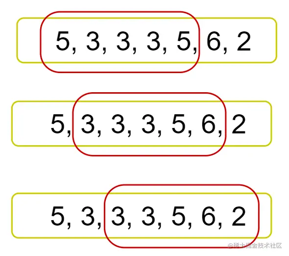 来我们一起来探索一下,同样还是 以 [ 5, 3, 3, 3, 5, 6, 2 ] ,time = 2 为例
