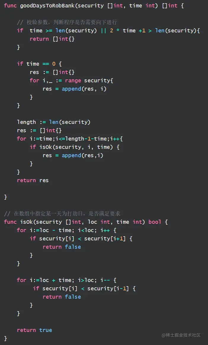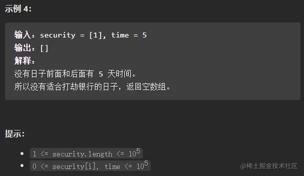security[i - time] >= security[i - time + 1] >= ... >= security[i] <= ... <= security[i + time - 1] <= security[i + time]根据条件,我们知道,无论选择哪一天打劫,需要满足,当天前需要有 time 天,且当天后也要有 time 天, 同时,前后的 time 天还要满足数据的要求,我们数组长度需要满足这个条件才有的玩:2 * time + 1 小于等于数组的长度