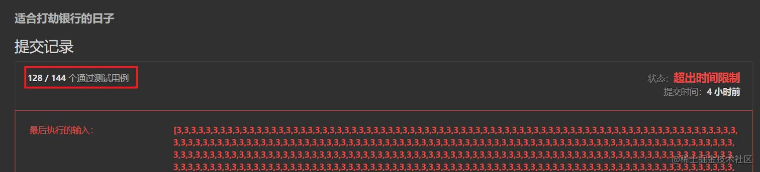 查看具体错误情况的时候,我们可以看到跑通了 128 个用例,但是对于一些数据量比较大的时候,上述的这种编码方式就不满足本题的要求了