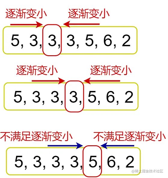 当然这只是其中一种解法,感兴趣的朋友可以看看更好的解法,例如官方的这种,直接引入 2 个数组,一个记录当前下标左边的递减情况,一个记录右边的递增情况,如下图这样
