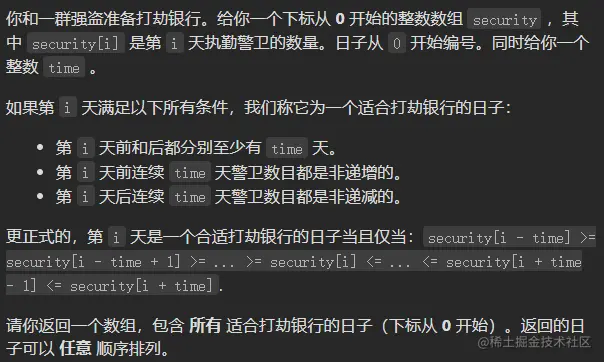 本次刷题日记的第 2 篇,力扣题为:2100. 适合打劫银行的日子 ,中等