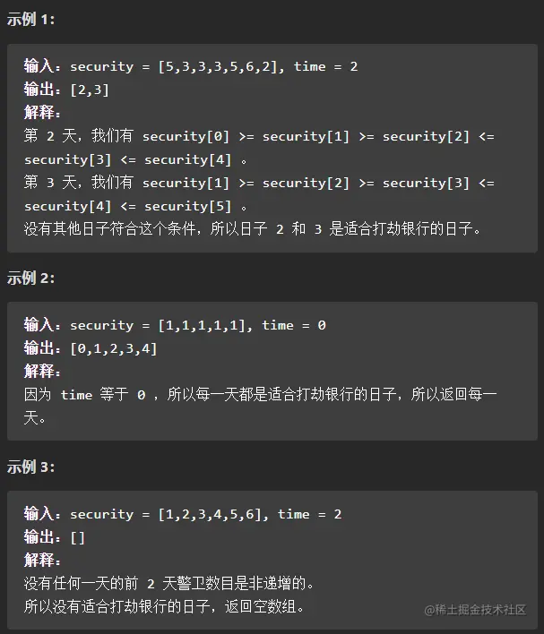 咱们只需要找到满足前 time 天和后 time 天对应的区间,然后校验区间是否满足题目中的要求:打劫当天的前 time 天,数字递减(可以相等),打劫当天的后 time 天,数字递增(可以相等)