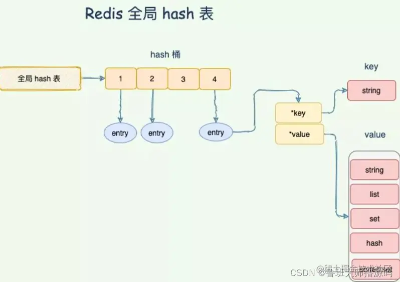 Redis 整体就是一个 哈希表来保存所有的键值对,无论数据类型是 5 种的任意一种。哈希表,本质就是一个数组,每个元素被叫做哈希桶,不管什么数据类型,每个桶里面的 entry 保存着实际具体值的指针。