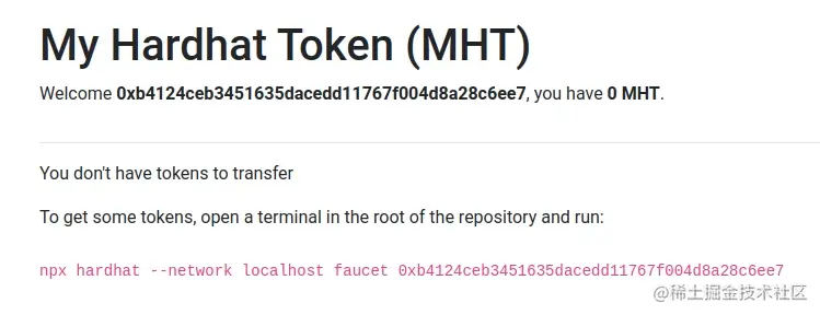 在我们的合约中显示transfer()函数的console.log输出,这是运行水龙头任务后web应用程序的样子: