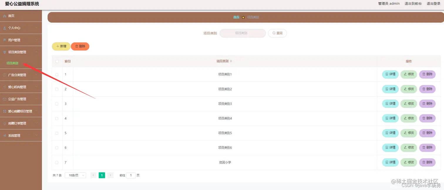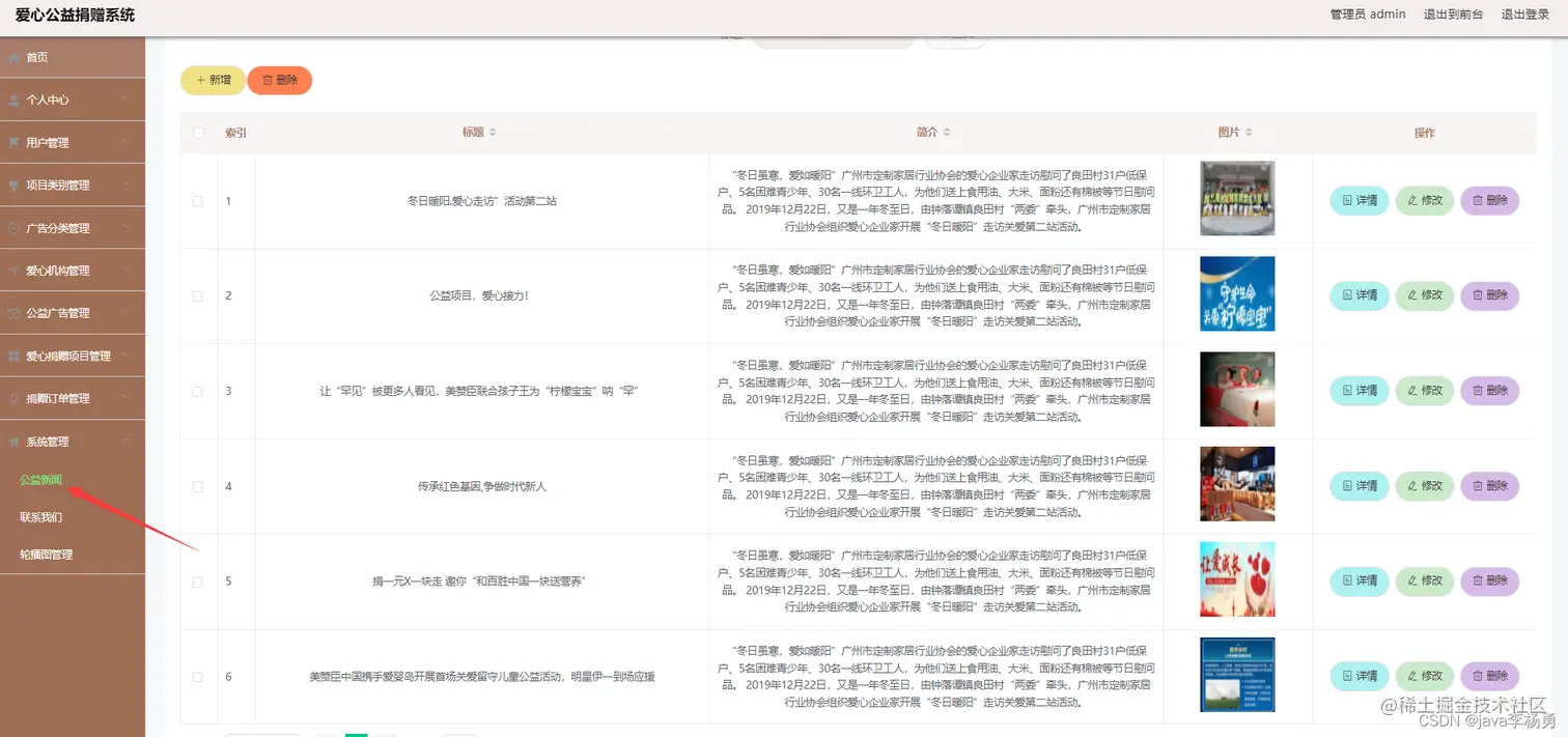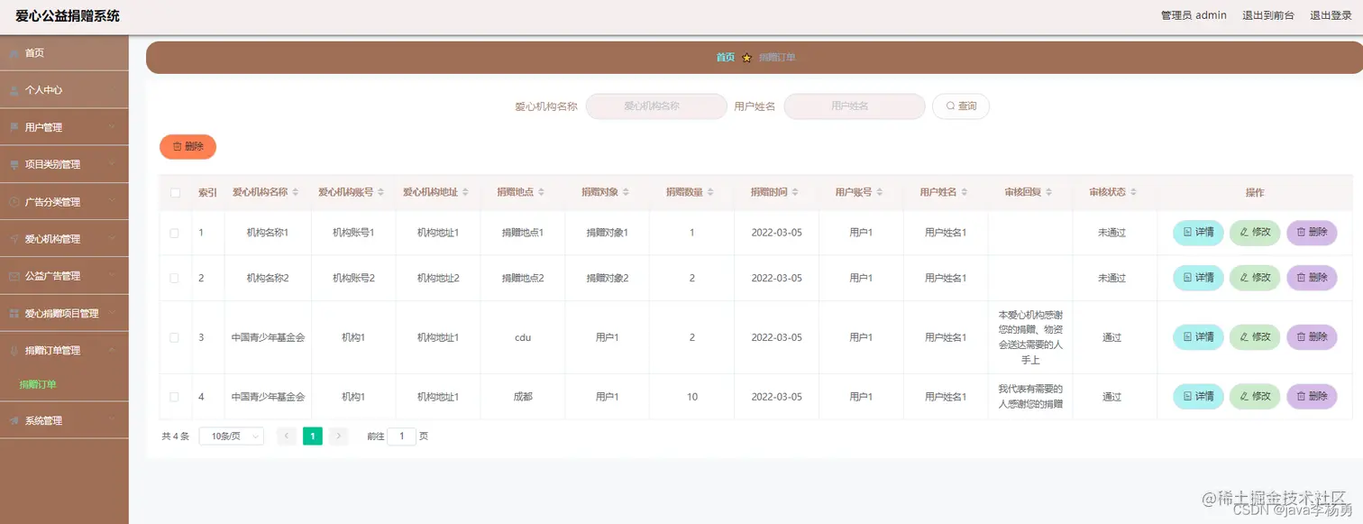 后台超级管理员信息:管理员登录进入系统之后,就可以对所有的信息进行查看,可以查看到首页、个人中心、用户管理、项目类别管理、广告分类管理、机构管理、广告信息管理、捐赠项目管理、捐赠订单管理、系统管理等,并且还可以对其进行相应的操作管理