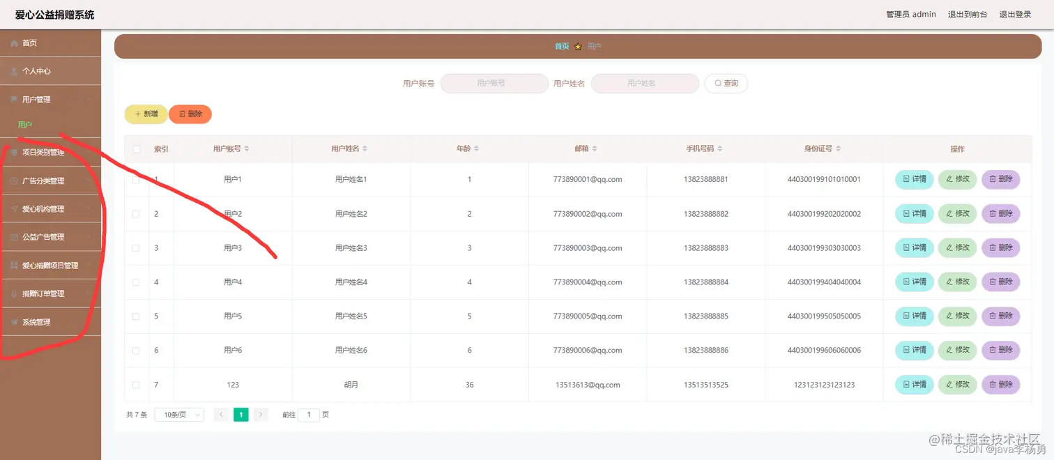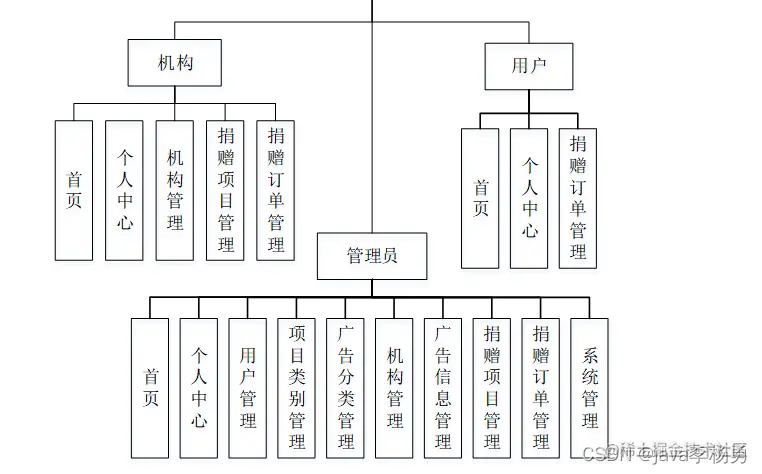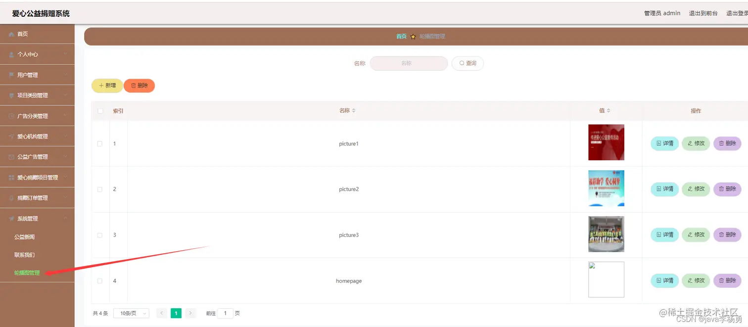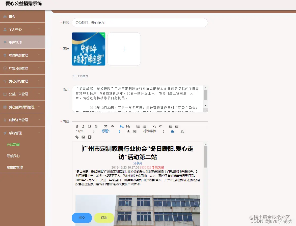 后台超级管理员信息:管理员登录进入系统之后,就可以对所有的信息进行查看,可以查看到首页、个人中心、用户管理、项目类别管理、广告分类管理、机构管理、广告信息管理、捐赠项目管理、捐赠订单管理、系统管理等,并且还可以对其进行相应的操作管理