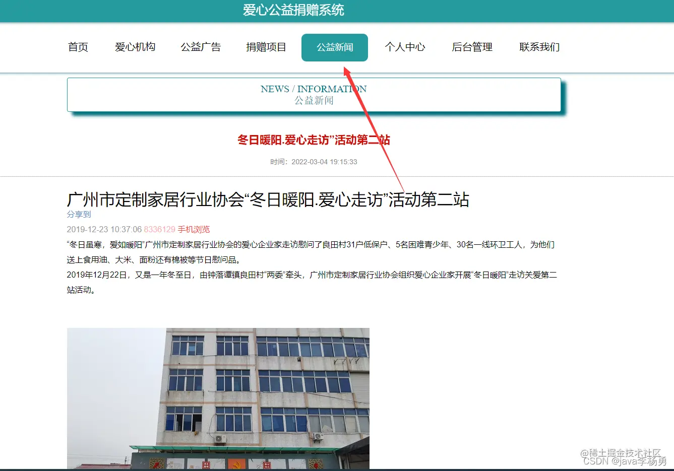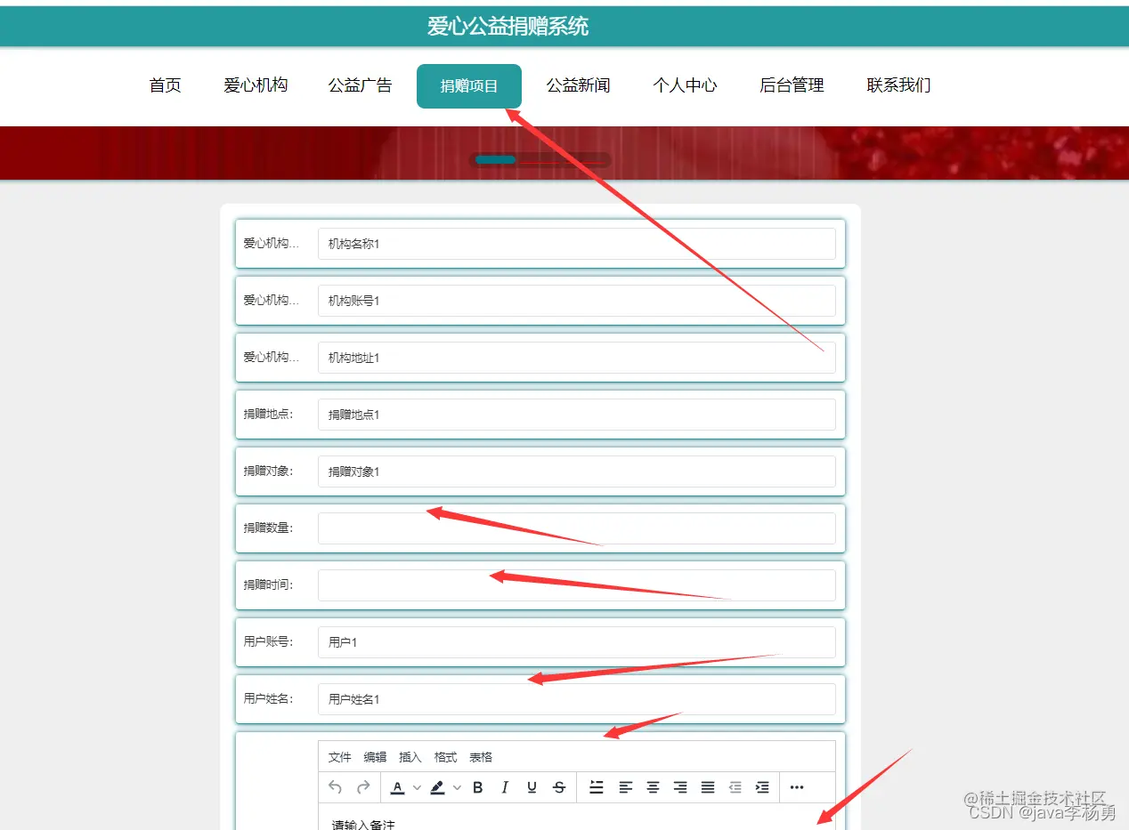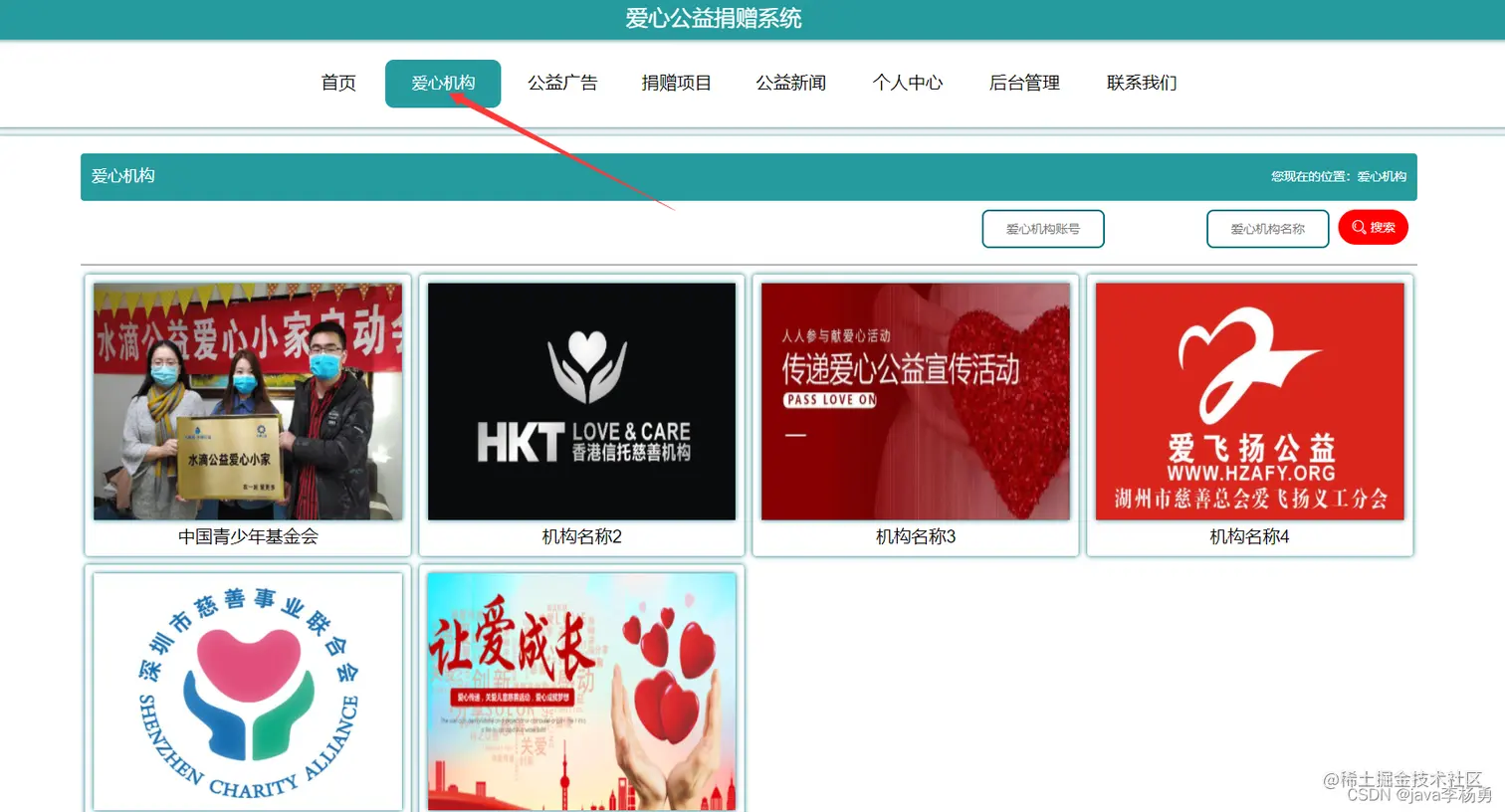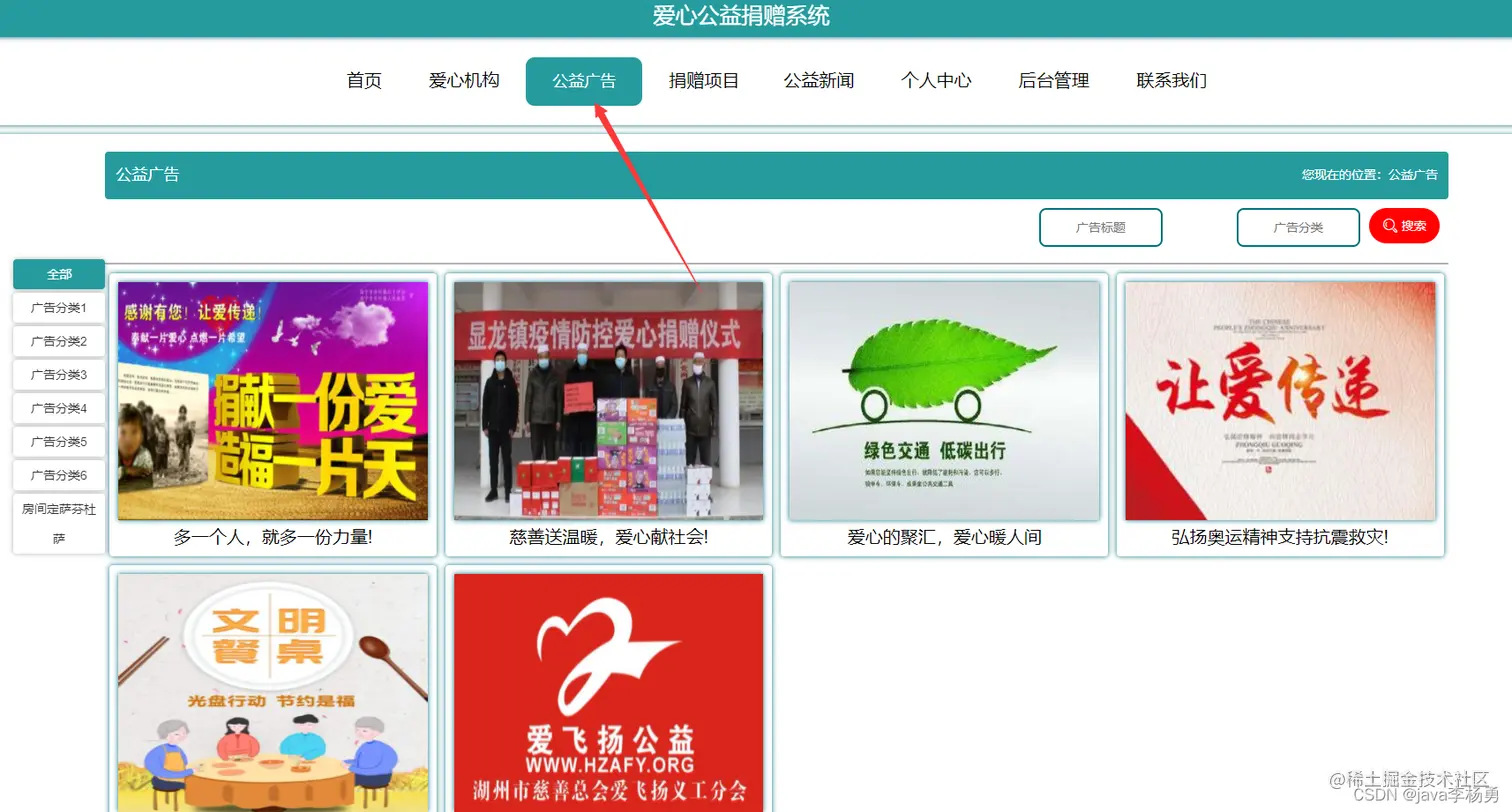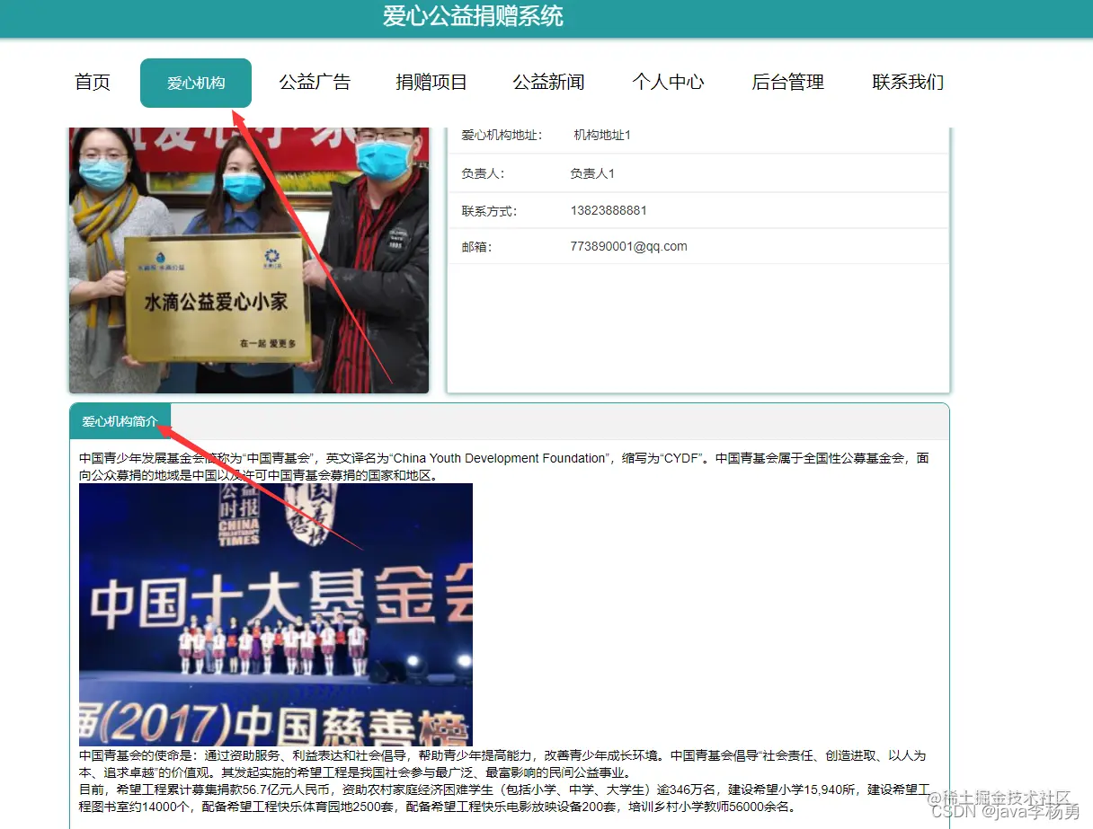 系统首页:在系统的首页可以查看首页、爱心机构、爱心广告信息、爱心捐赠项目、爱心网站新闻、个人中心、后台管理、联系我们等信息进行详细操作