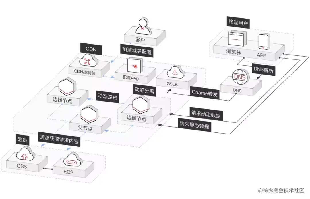 - 用户向缓存服务器发起请求,缓存服务器响应用户请求,将用户所需内容传送到用户终端。如果这台缓存服务器上并没有用户想要的内容,而区域均衡设备依然将它分配给了用户,那么这台服务器就要向它的上一级缓存服务器请求内容,直至追溯到网站的源服务器将内容拉到本地。