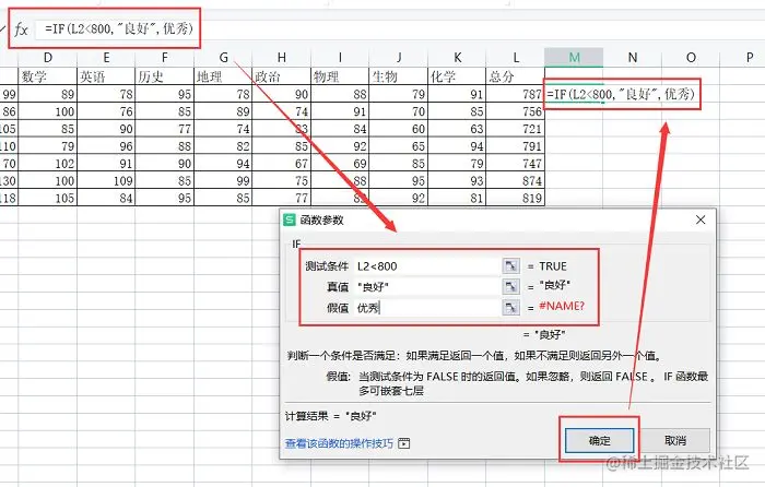 步骤二: 在“测试条件”点击需要判断的数据的单元格,再以英文小写的模式填入“<800”,“真值”就是对应的数据是不是为真,例如:“787<800”,为真,所以“真值”填入“良好”,相反,“假值”填入“优秀”,意思是“>800”的数据为“优秀”,最后点击“确定”。