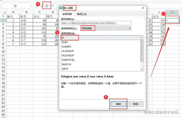 步骤一: 首先在空白的单元格点击一下,然后在工具栏内找到“fx”,点击进去,在跳出的对话框内找到“if函数”,最后点击“确定”。(也可以直接在空白单元格内输入“=if”)