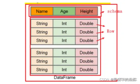 DataFrame也是弹性分布式数据集,但是本质上是一个分布式数据表,因此称为分布式表更准确。DataFrame每个元素不是泛型对象,而是Row对象。