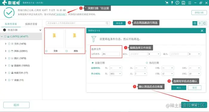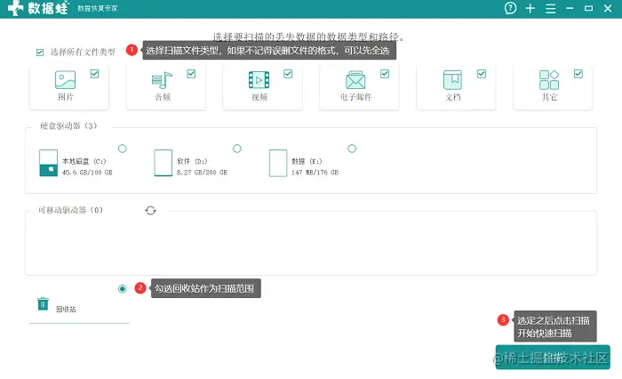步骤1. 打开上面介绍的软件——数据恢复专家,进入主界面后,选择需要扫描的文件类型(首次扫描建议全选)和路径(回收站)。