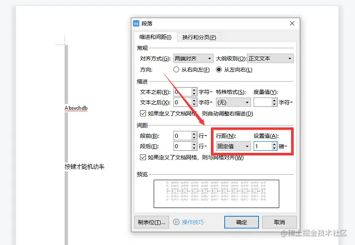 步骤二: 在弹出的“段落”对话框内,找到“行距”,将“固定值”改为“1”,“确定”即可。