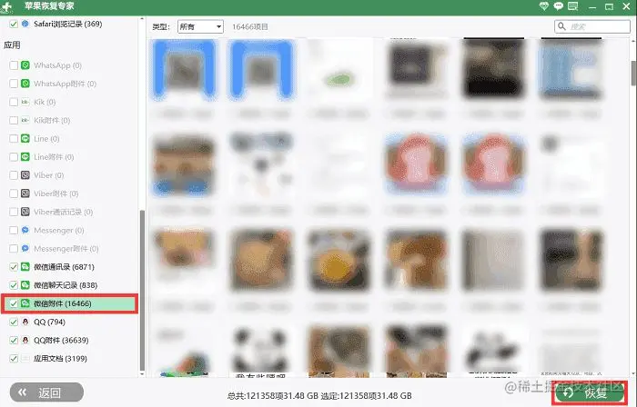 步骤3:扫描完成以后,从左侧拉到最底部便可以看到【微信附件】,根据自己的需求找到想要恢复的图片,点击右下角【恢复】即可。