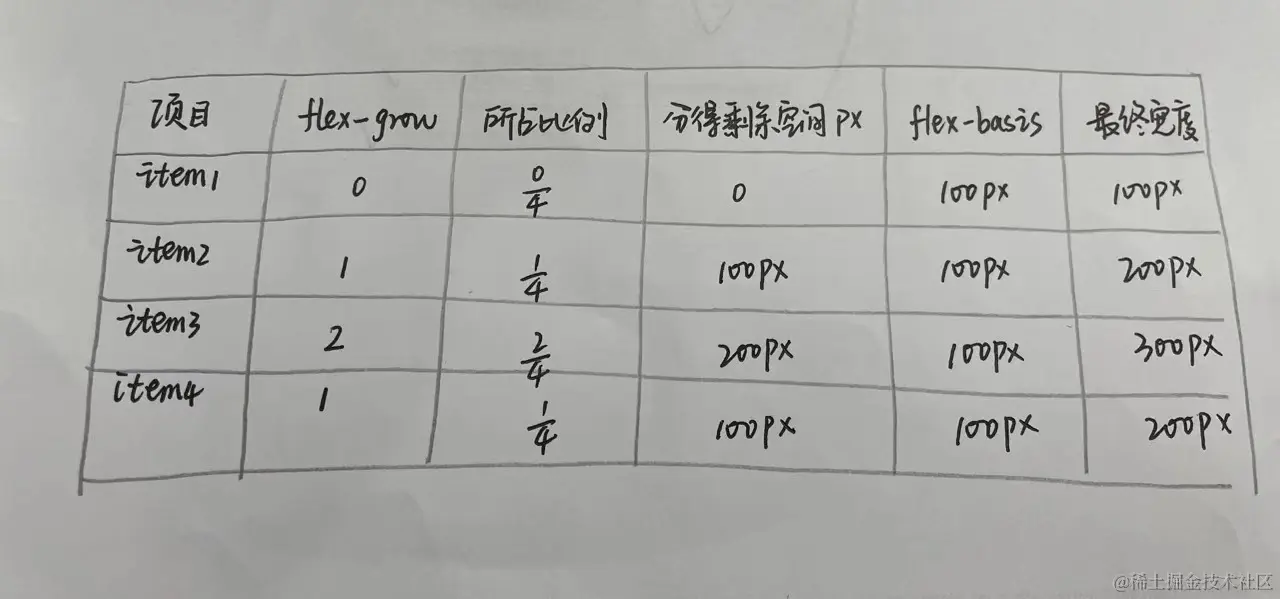 flex-basis默认auto,在代码中指的是项目自身宽度100px,所以主轴的剩余空间是:800px-100px-100px-100px-100px = 400px