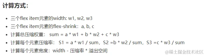 如果子项目宽度超过父容器宽度,即使是设置了 flex-grow,但是由于没有剩余空间,就分配不到剩余空间了。这时候有两个办法:换行和压缩。由于 flex 默认不换行,那么就采用 flex-shrink 压缩