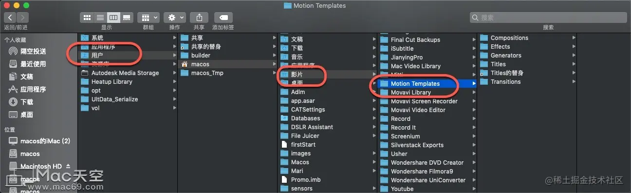1、在Mac天空下载模板后先解解压缩出来,退出Final Cut Pro X。打开访达找到影片文件夹并打开它。里面是一个名为“Motion Templates ” 的文件夹。