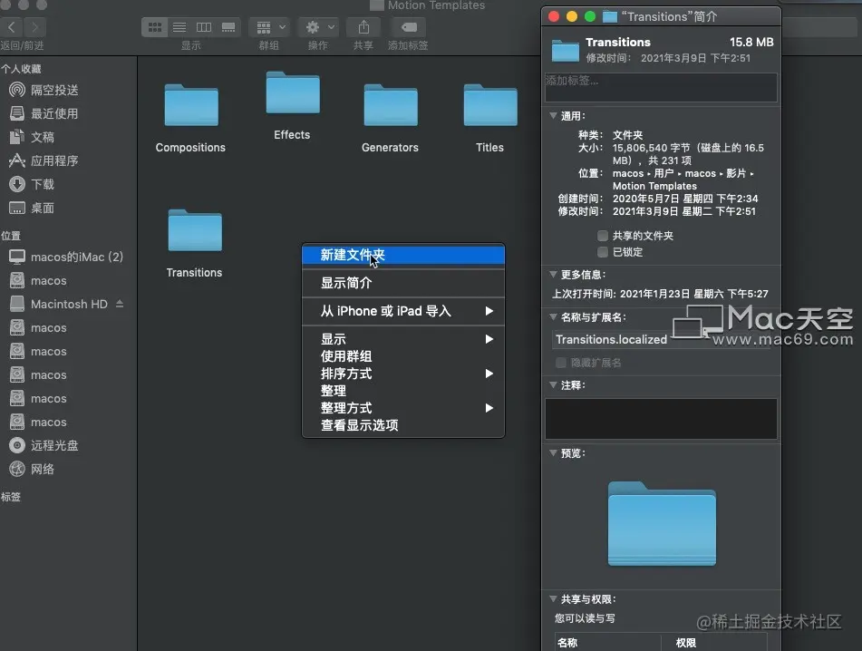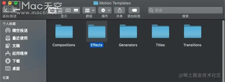 Compositions【合成】/Effects【效果】/Generators【发生器】/Titles【标题】/Transitions【转场】如果没有这个文件夹的话自己建立一个,右键新建文件夹名称为“Transitions”文件夹,然后选定目录或者使用快捷键Command + i 将Transitions文件夹重命名为Transitions.localized。