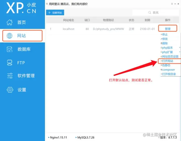 在StudyPHP面版--网站--选择localhost 80的默认站点,点击管理,弹出下拉菜单,选择打开网站,会弹出浏览器,打开本地默认站点http://localhost