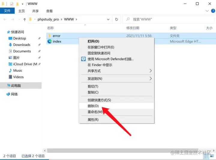 默认在 D:\phpstudy_pro\WWW, 我们将目录里所有文件删除,如下图