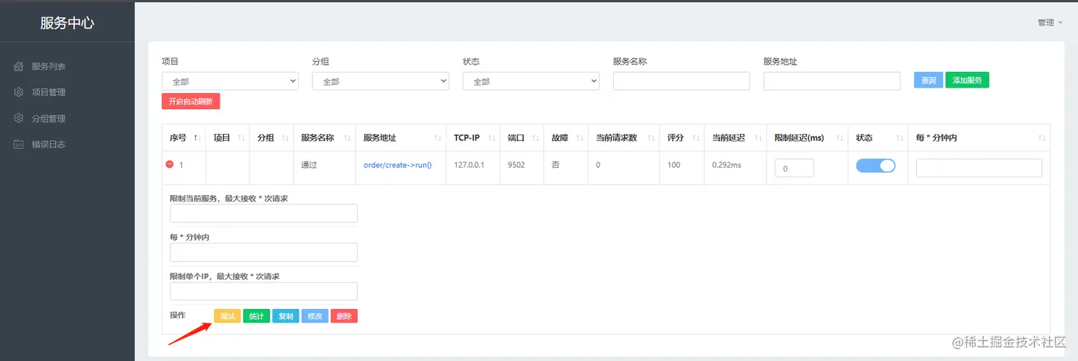 如果你没有开启热重载,就需要先重启服务端,才能进行调试,下面是在服务中心里的调试结果: