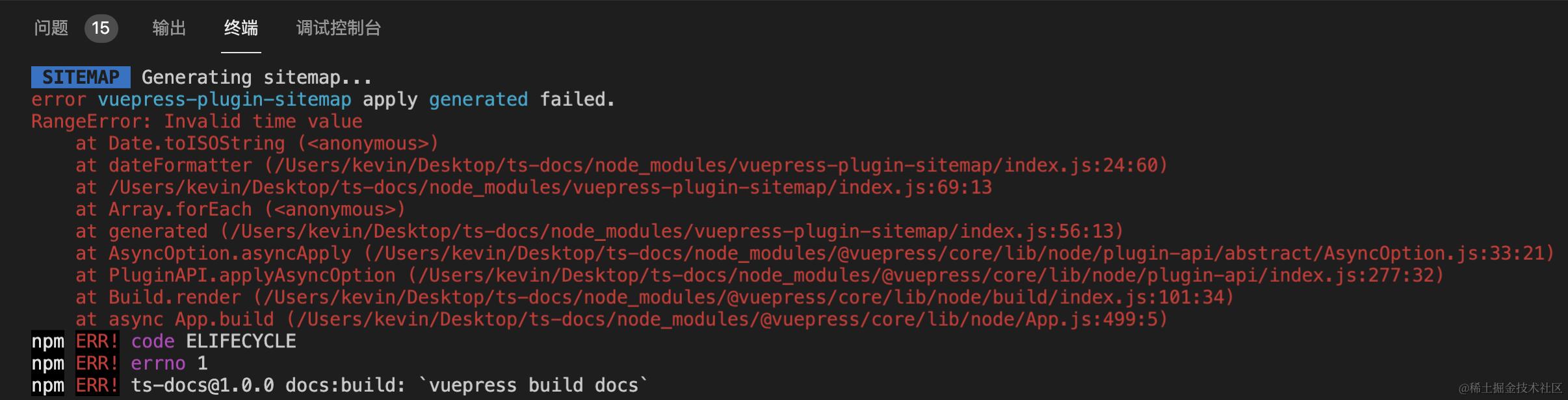 这可能是因为你设置了 lastUpdated 或者使用了 @vuepress/last-updated 插件,当两个一起用的时候,因为时间对象的缘故,产生了报错,我们搜索 vuepress-plugin-sitemap 的 issues,可以找到一个解决方法,我们修改一下 config.js: