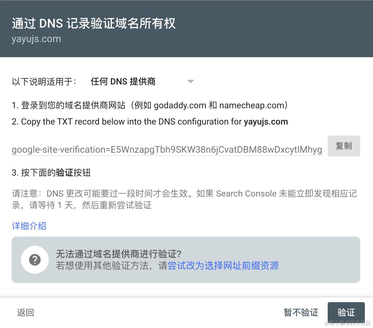 这里我选择的是「网域」,输入域名后,会让你进行 DNS 验证: