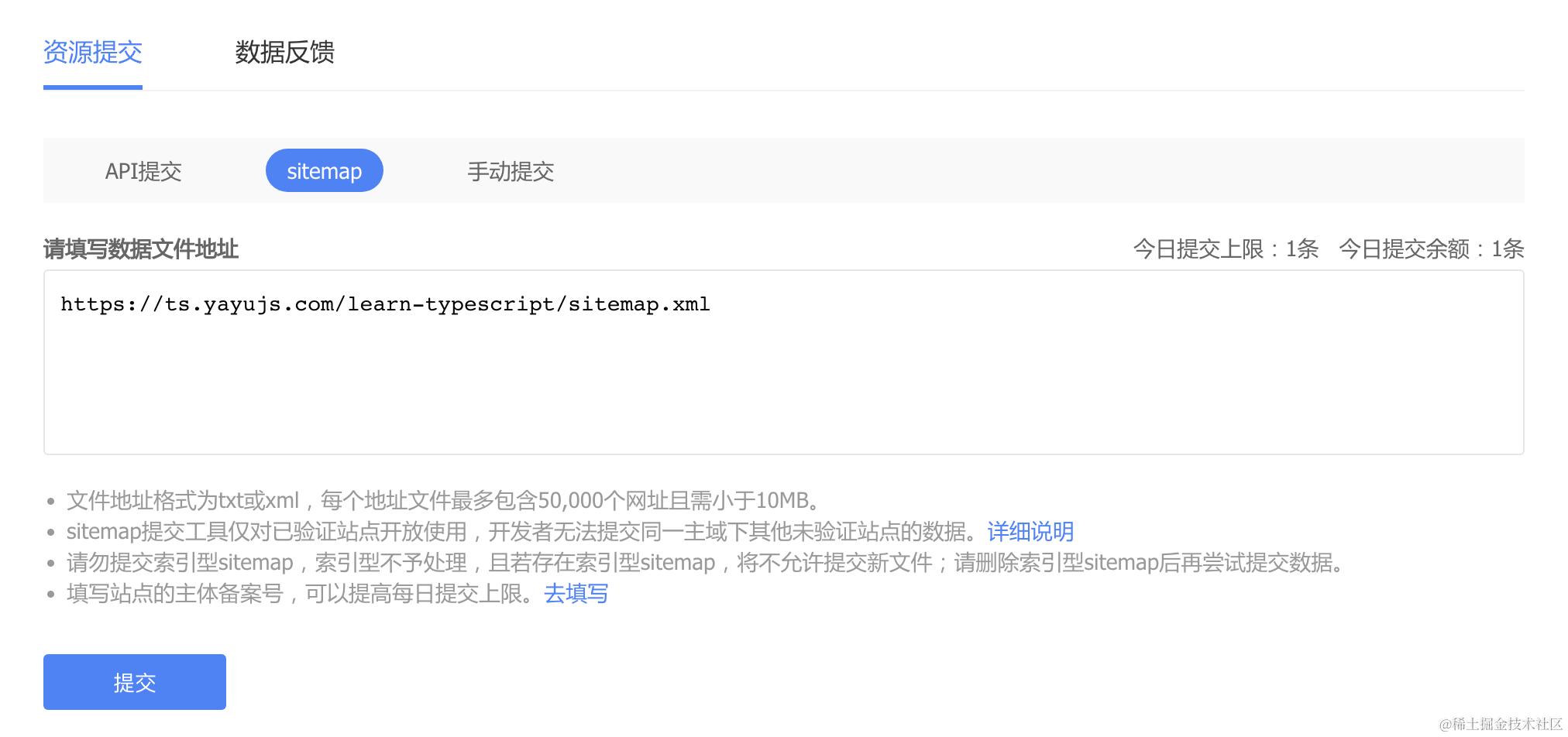 这里提供了三种方式收录:API 提交、sitemap、手动提交,那该如何选择呢?参考平台工具使用手册: