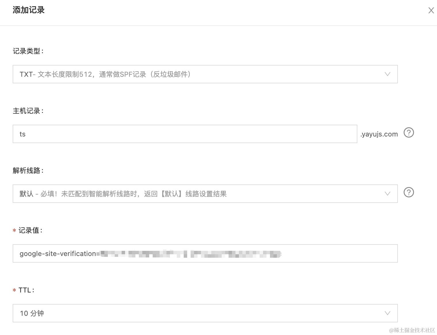 记录类型选择TXT,记录值填写 Google 提供的内容: