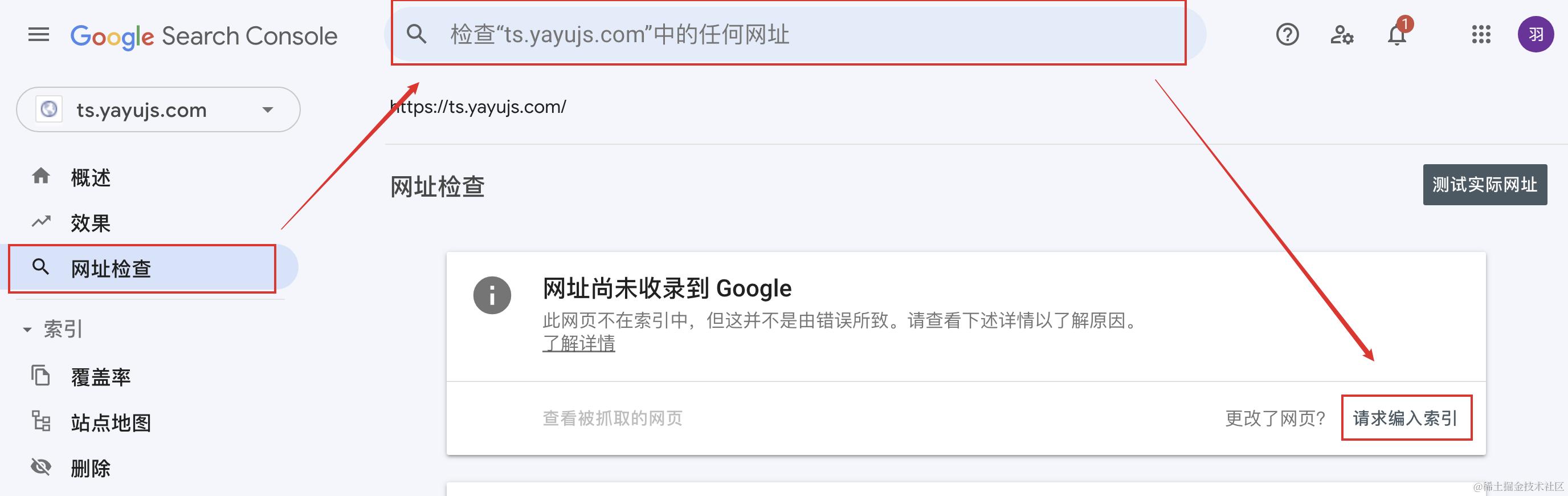 点击左侧导航栏「网站检查」,输入要检查的域名,如果没有收录到 Google 中,点击「请求编入索引」: