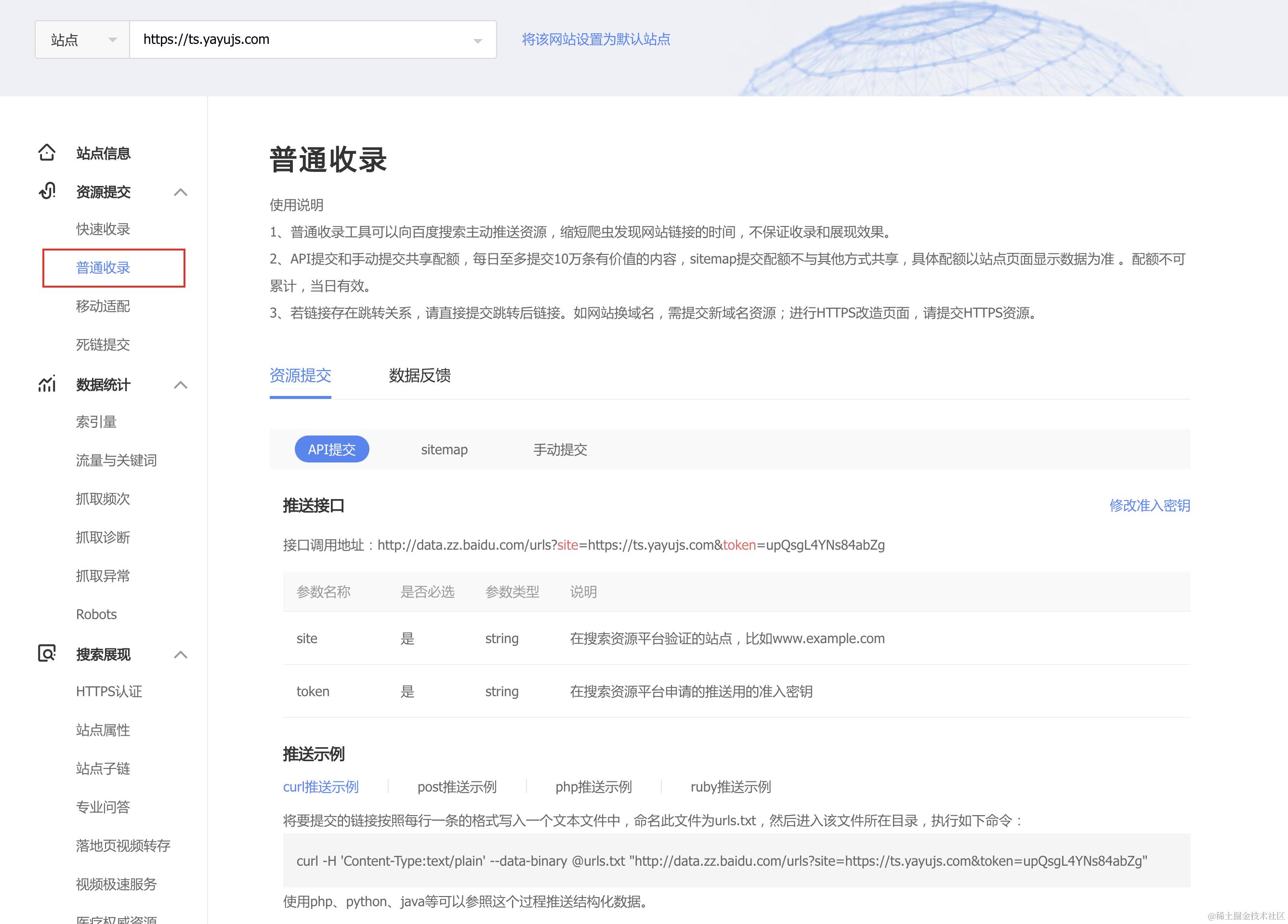 在站点管理页面,点击「普通收录」:
