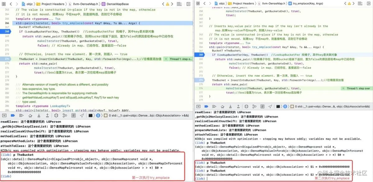 try_emplace插入的是一个空桶,还没有值,第二次执行第一次执行try_emplace才插入值,即往空桶中插入ObjectAssociationMap(value,policy),返回true,可以通过调试验证