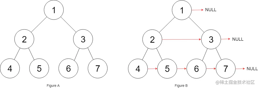 填充它的每个 next 指针,让这个指针指向其下一个右侧节点。如果找不到下一个右侧节点,则将 next 指针设置为 NULL。