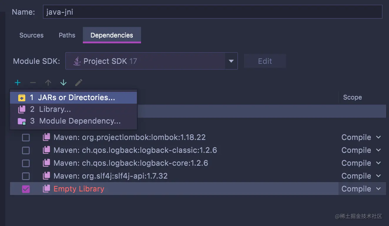 选择java-jni的module,在依赖中选择JARs or Directories, 选择刚刚的libJNIUsage.dylib 目录。
