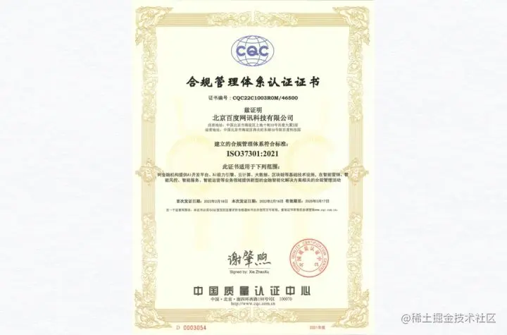 百度智能云以智慧金融业务为切入点,依据 ISO 37301要求,开展针对智慧金融业务合规管理工作的梳理及合规风险识别,通过了 CQC 在文件评审、现场审核等环节的严格评审,最终收获了行业首家合规管理体系认证证书,树立起行业规范性发展的标杆形象。