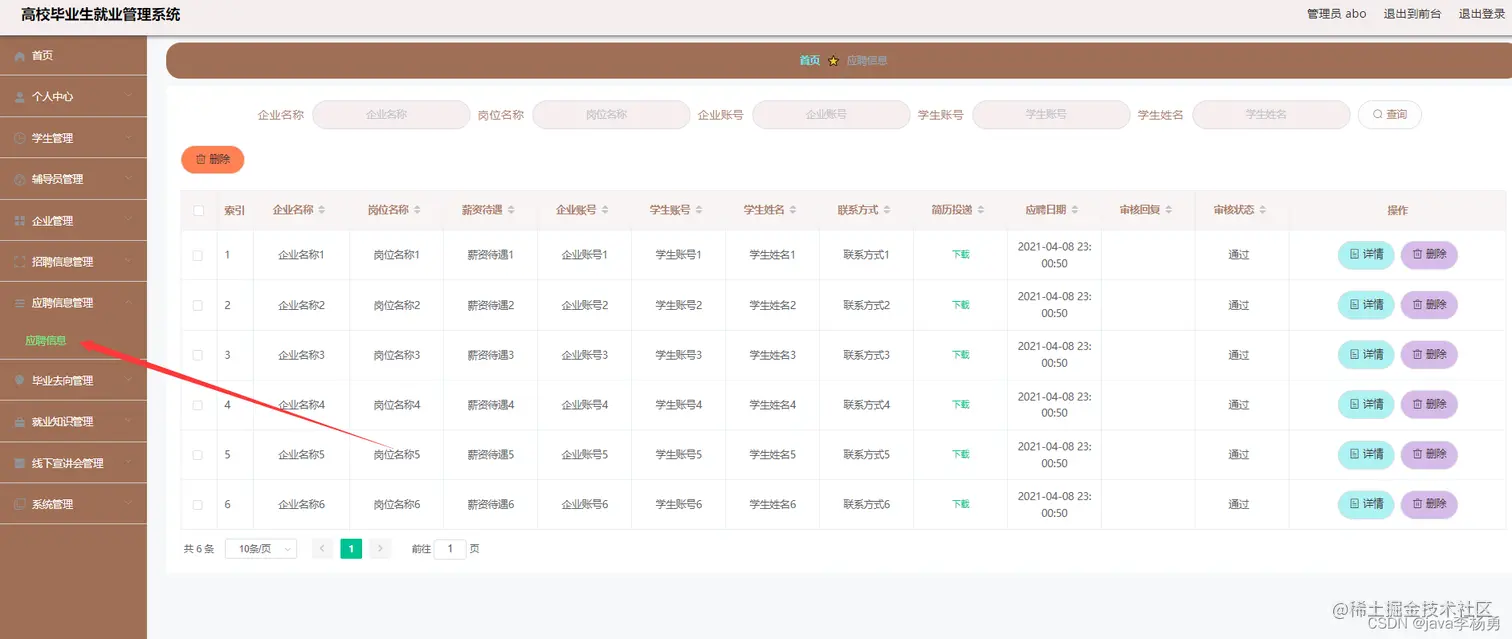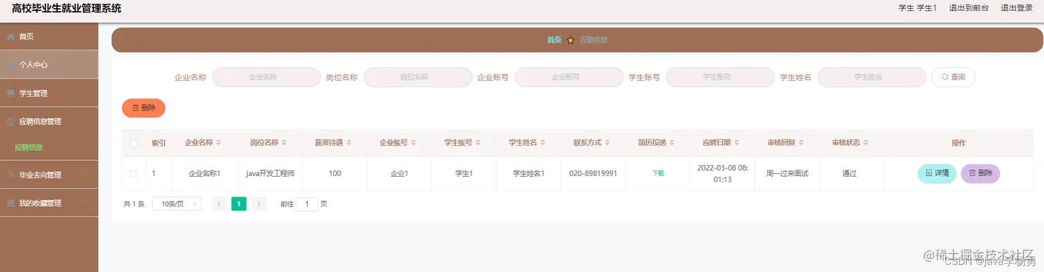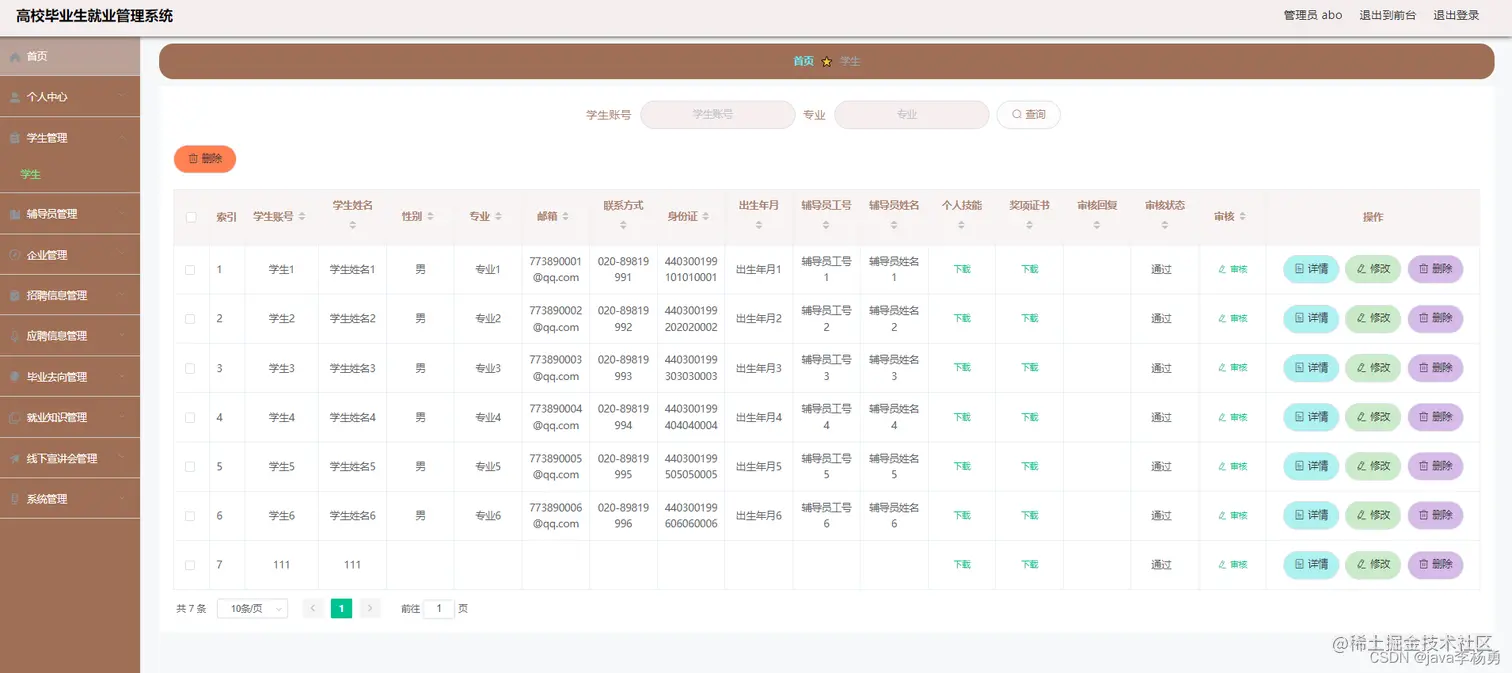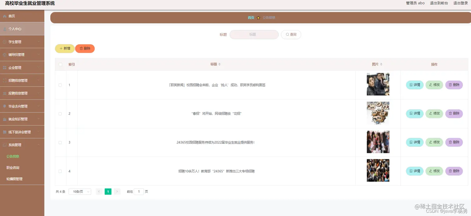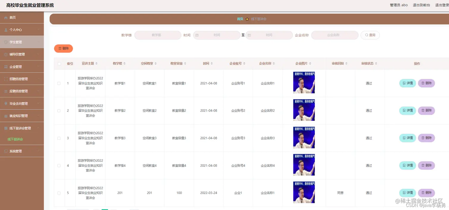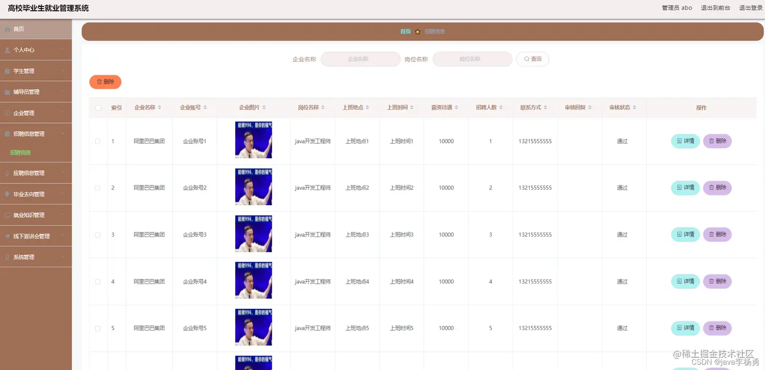 管理员后台管理:管理员登录进入系统之后,就可以对所有的信息进行查看,可以查看到首页、个人中心、学生管理、辅导员管理、企业管理、招聘信息管理、应聘信息管理、毕业去向管理、就业知识管理、系统管理等,并且还可以对其进行相应的操作管理