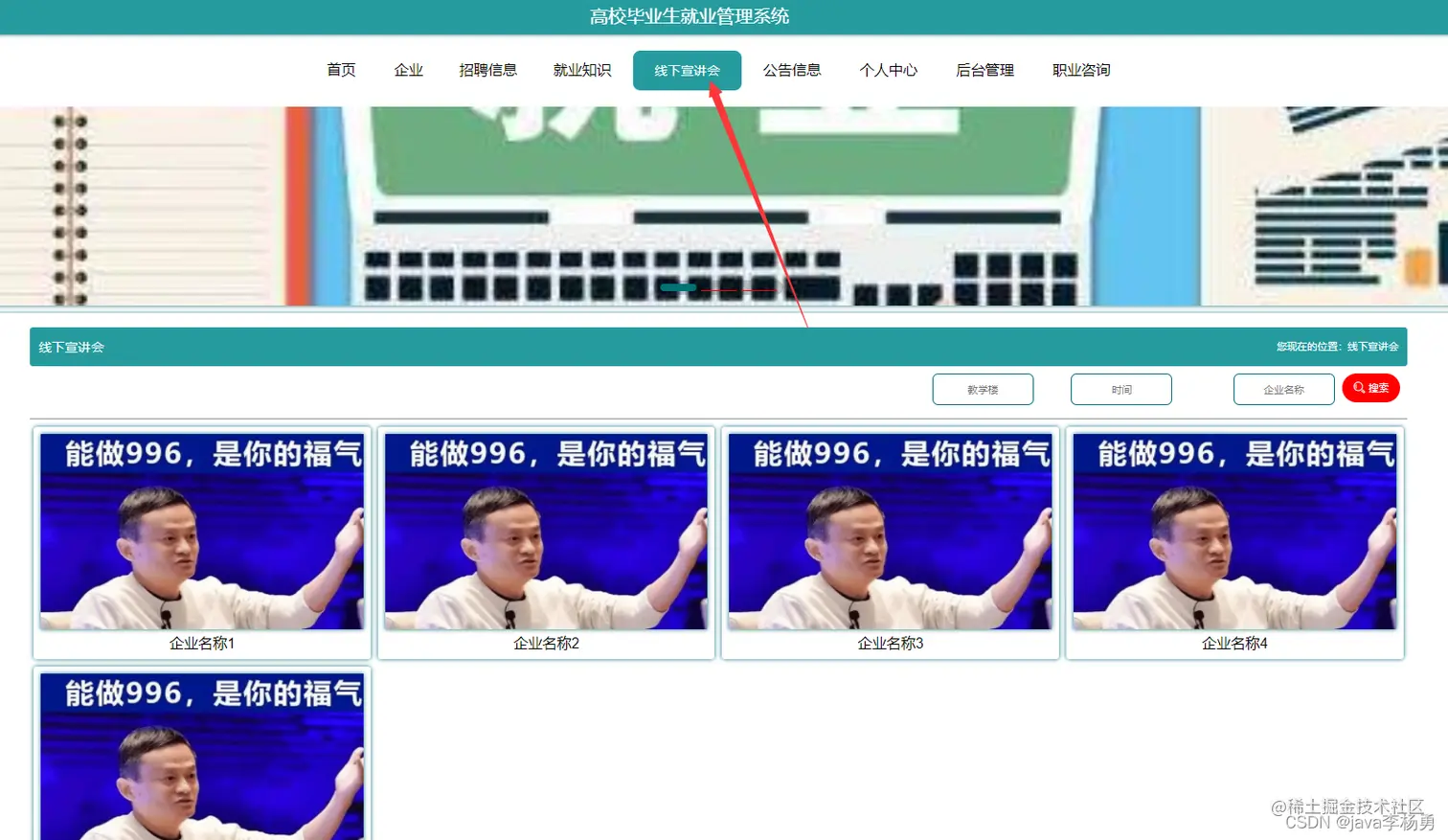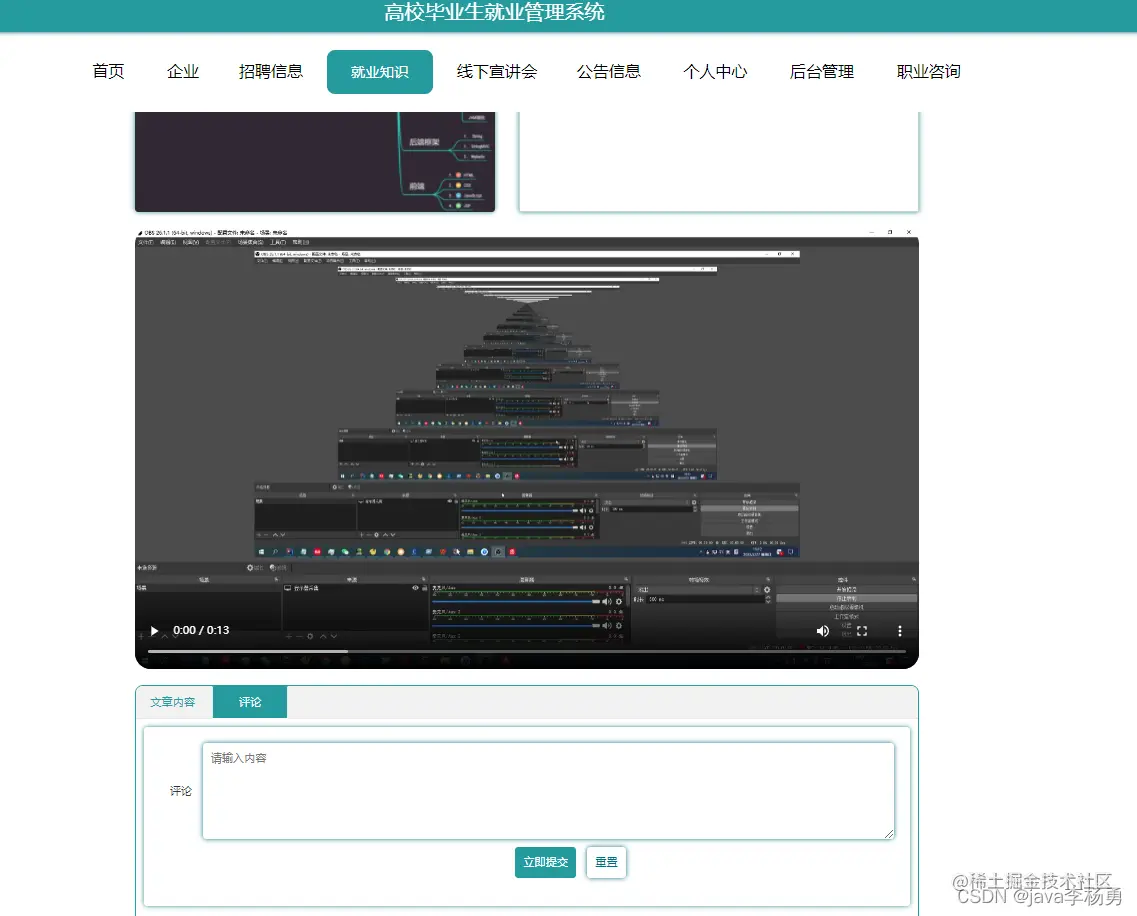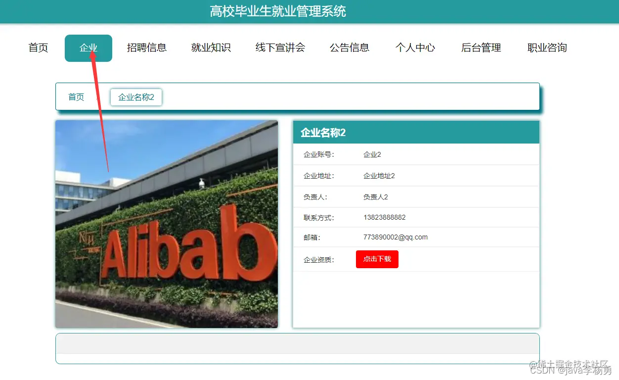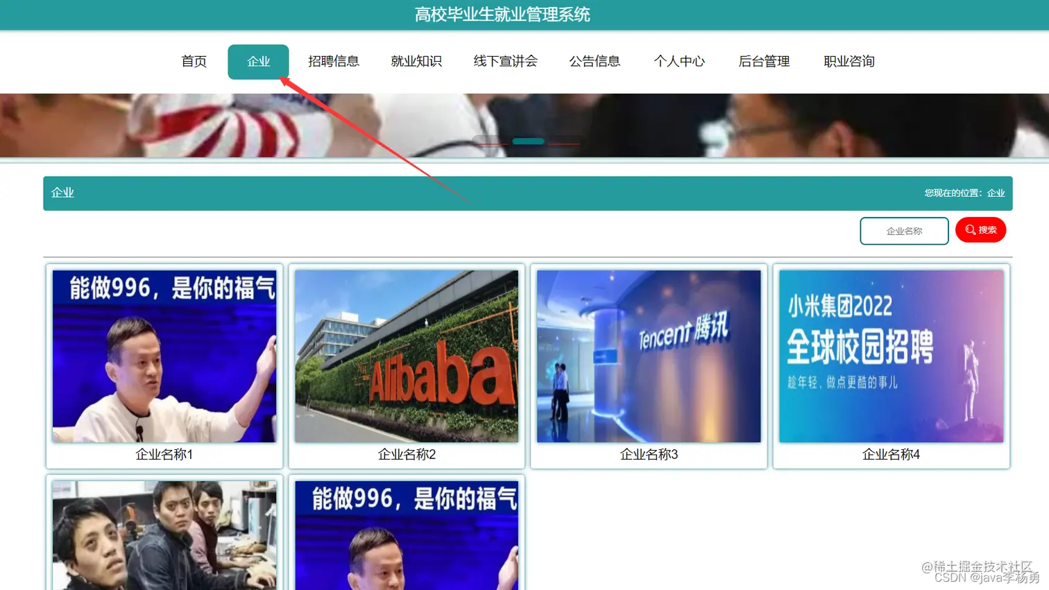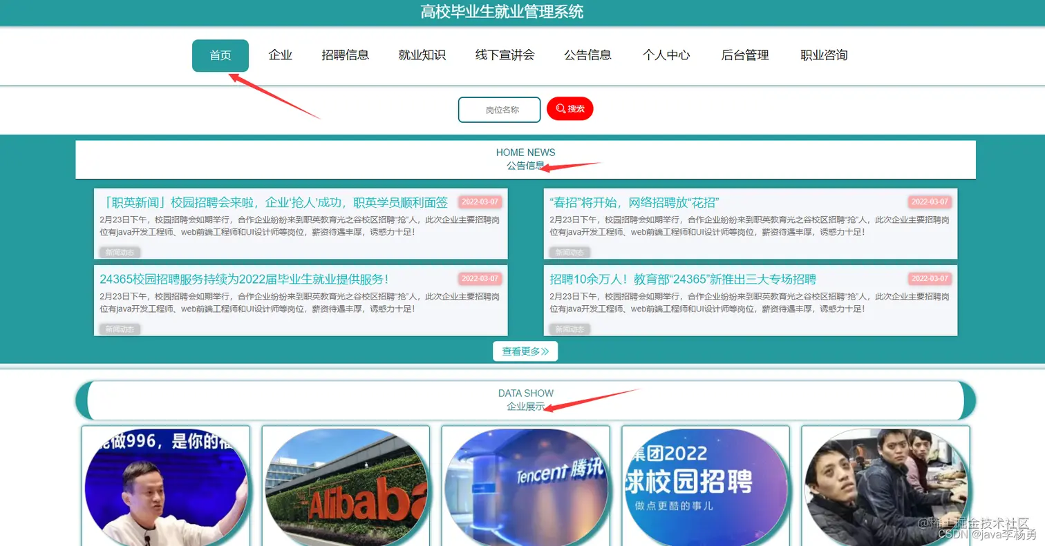 系统首页:首页可以查看首页、企业、招聘信息、就业知识、公告信息、个人中心、后台管理等信息进行详细操作