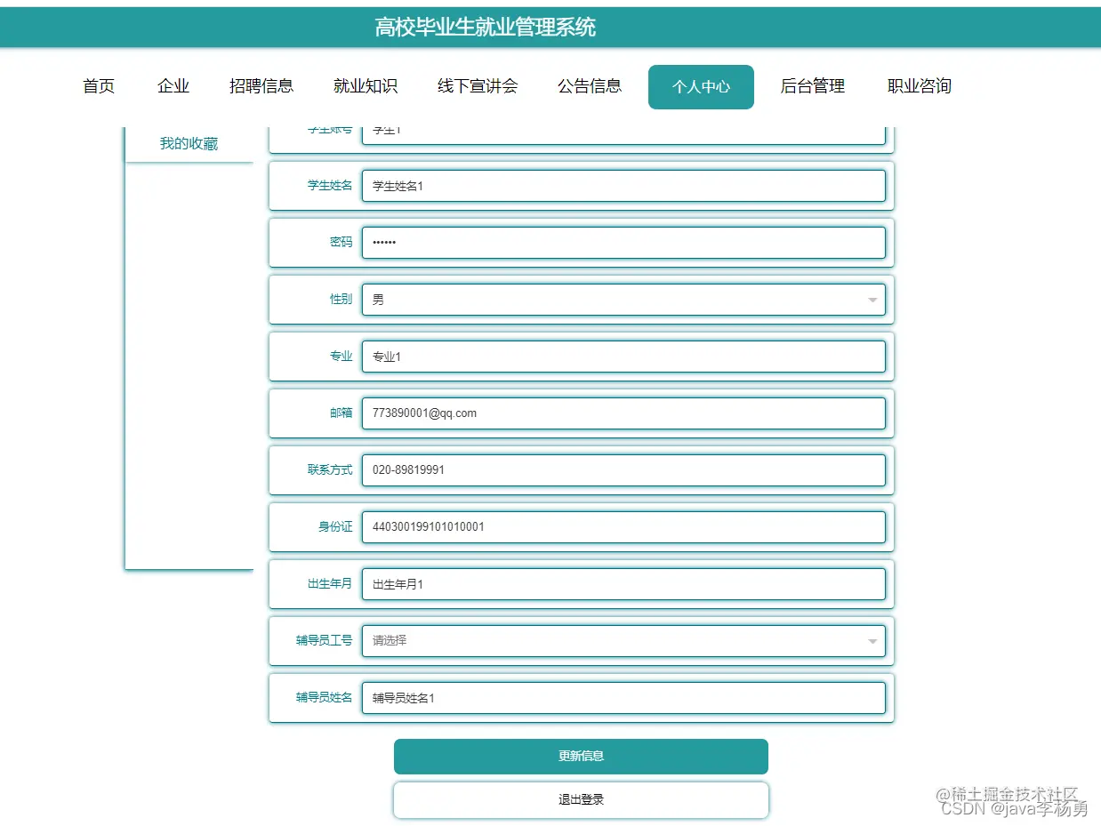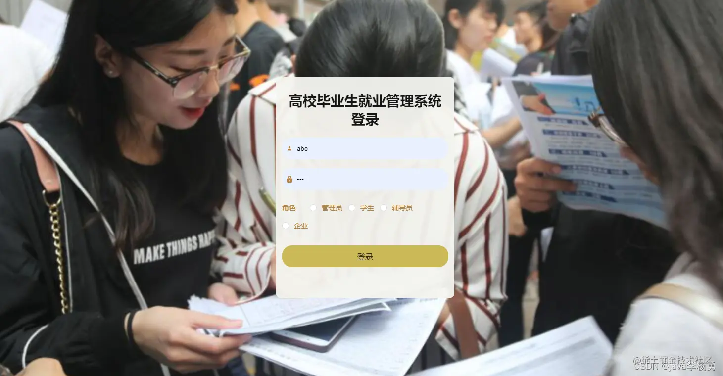 登录注册:管理员、学生、辅导员和企业四个角色,都可以简单明了的进入到自己的系统界面,通过界面导航菜单可以简单明了地操作功能模块,方便用户信息的操作需求和管理员管理数据信息