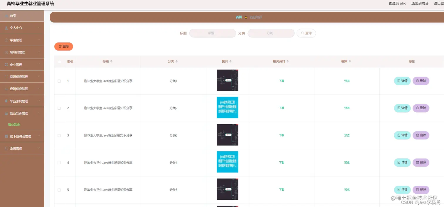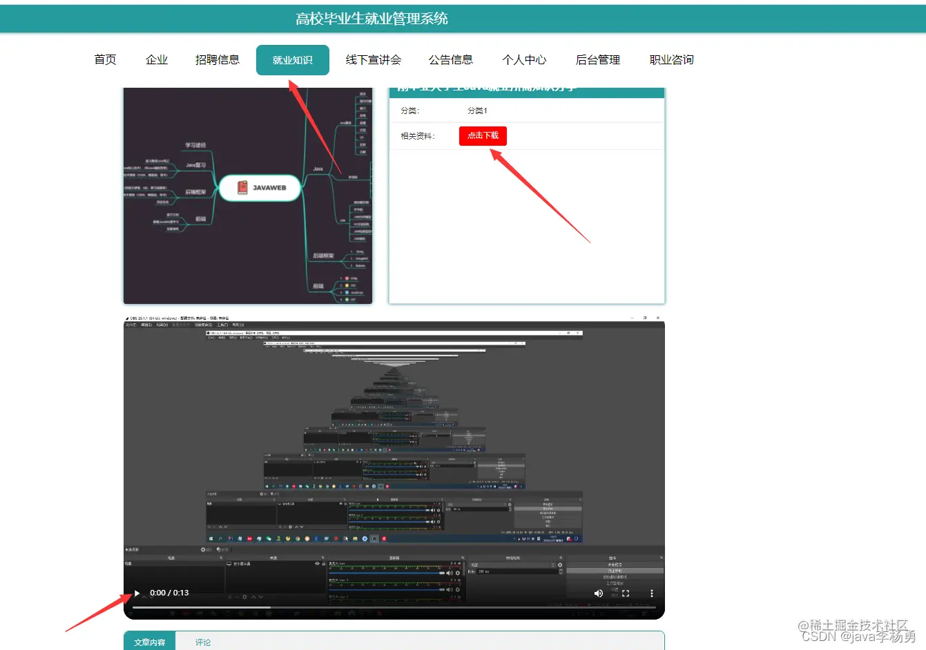 就业知识:在就业知识页面中可以查看标题、分类、图片、相关资料、视频等信息