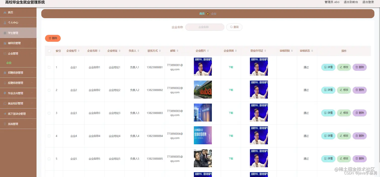 企业管理:在企业管理页面中可以对索引、企业账号、企业名称、企业地址、负责人、联系方式、邮箱、企业图片、附件等信息进行详情,修改或删除等操作