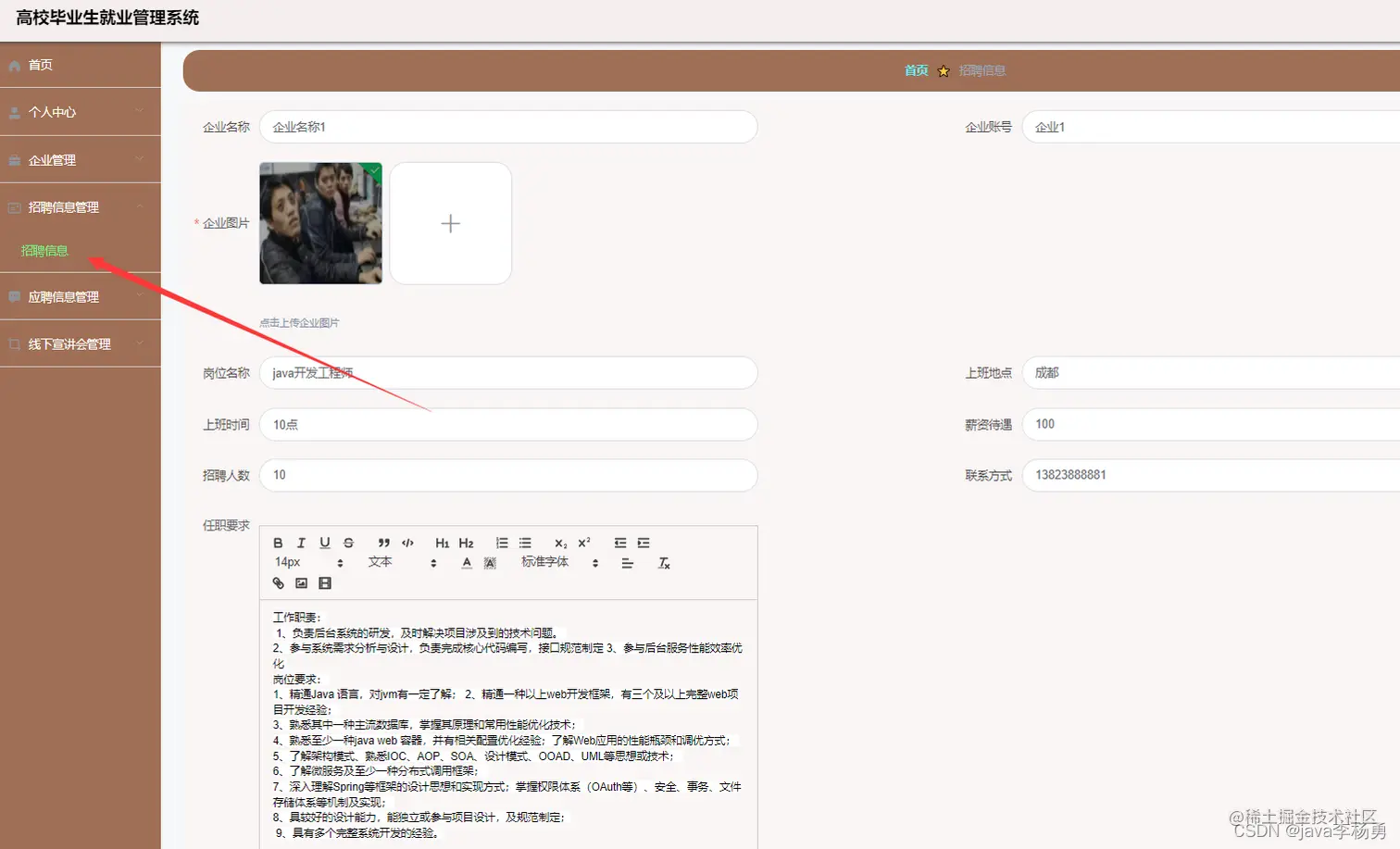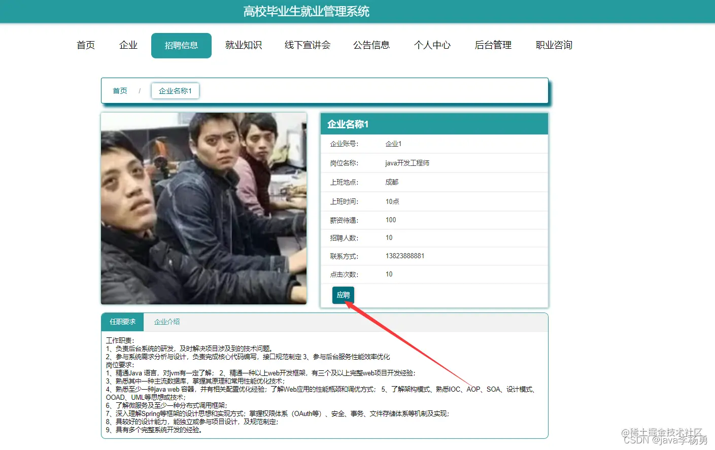 招聘信息:在招聘信息页面中可以查看企业名称、企业账号、岗位名称、上班地点、上班时间、薪资待遇、招聘人数、联系方式、点击次数、任职要求、企业介绍等信息