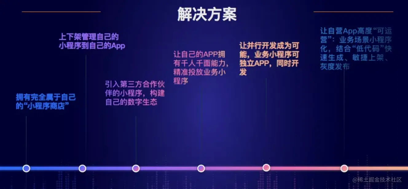 涉及到数字化营销,这里还有一个很重要的点要讲,**那就是营销活动或者创意的快速上架,以及用完即扔的极致体验。**大概场景类似于:我们计划在 App 内做一个营销活动,业务人员上午给开发团队提出需求,希望下午研发运维人员就可以把这个营销活动的需求的功能给做完,然后直接在 App 里上线。**小程序功能的普及让这种活动类或者营销类的需求可以真正实现当天需求当天解决。**最后,我还想提一下小程序为客户的 App 所带来的大厂生态的引入,即小程序可以通过开通接口的能力实现与大厂资源的无缝对接。