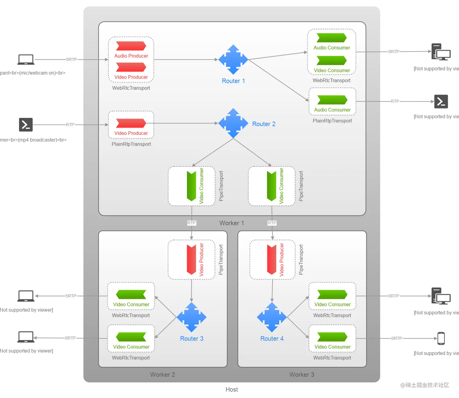 一个节点或者一个进程, 实际应该是进程, 代码中根据CPU核数启动相对应地worker数量, 一个房间只能在一个房间里, 但是可以通过pipeTransport进行跨worker的通信.