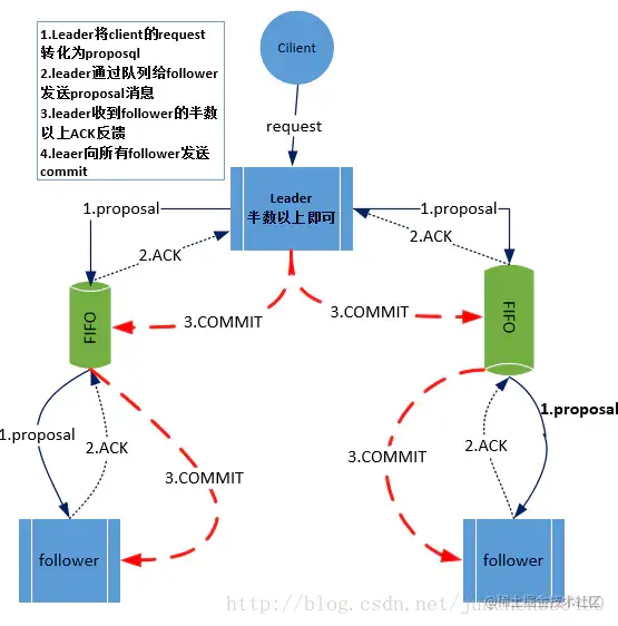 在消息⼴播过程中,Leader服务器会为每⼀个Follower服务器都各⾃分配⼀个单独的队列,然后将需要⼴播的事务Proposal依次放⼊这些队列中去,并且根据 FIFO策略进⾏消息发送。每⼀个Follower服务器在接收到这个事务Proposal之后,都会⾸先将其以事务⽇志的形式写⼊到本地磁盘中去,并且在成功写⼊后反馈给Leader服务器⼀个Ack响应。当Leader服务器接收到超过半数Follower的Ack响应后,就会⼴播⼀个Commit消息给所有的Follower服务器以通知其进⾏事务提交,同时Leader⾃身也会完成对事务的提交,⽽每⼀个Follower服务器在接收到Commit消息后,也会完成对事务的提交。